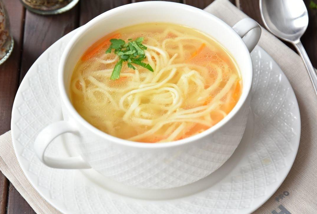 Ароматный куриный бульон с куриным филе, лапша домашняя,