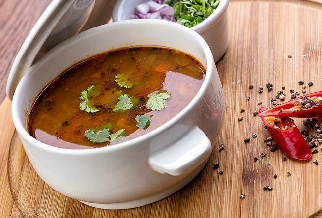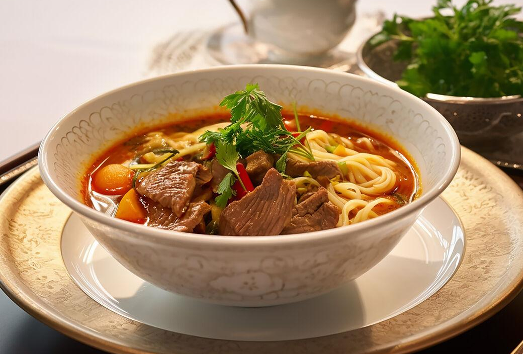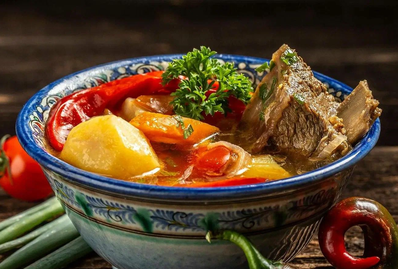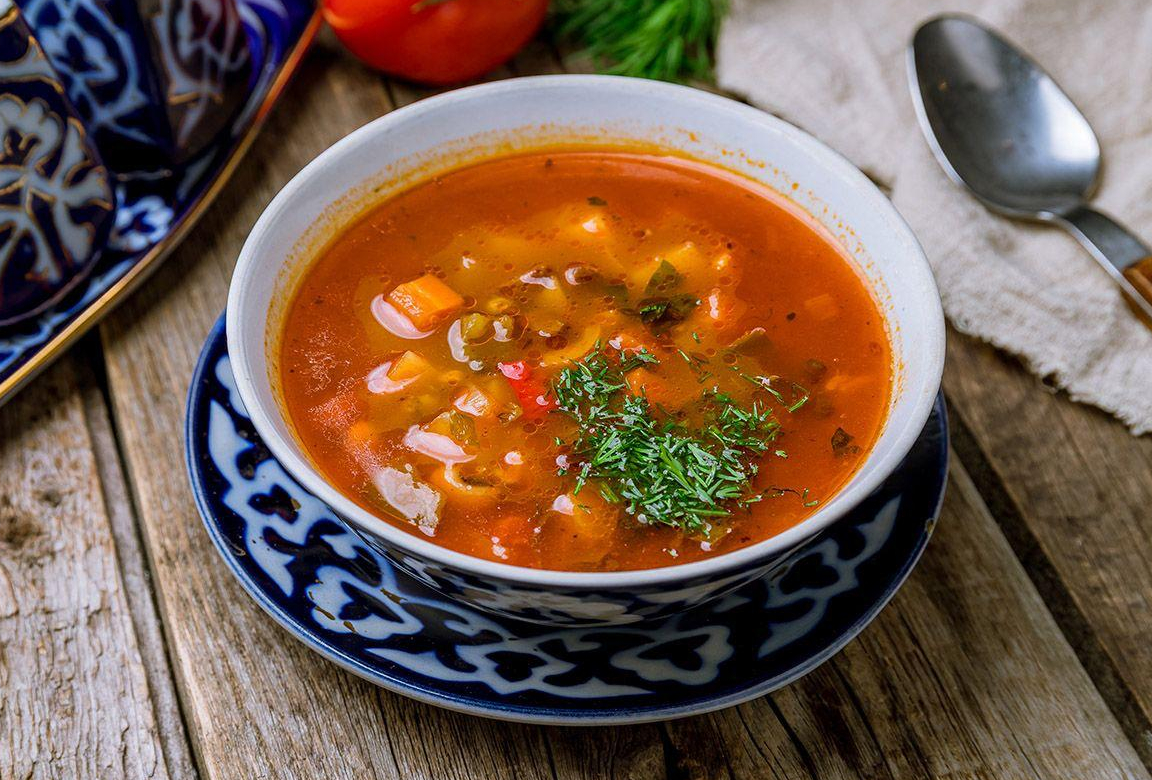 Грузинский суп из телятины со спелыми томатами, рисом и ароматными специями. Подаётся с аджикой.