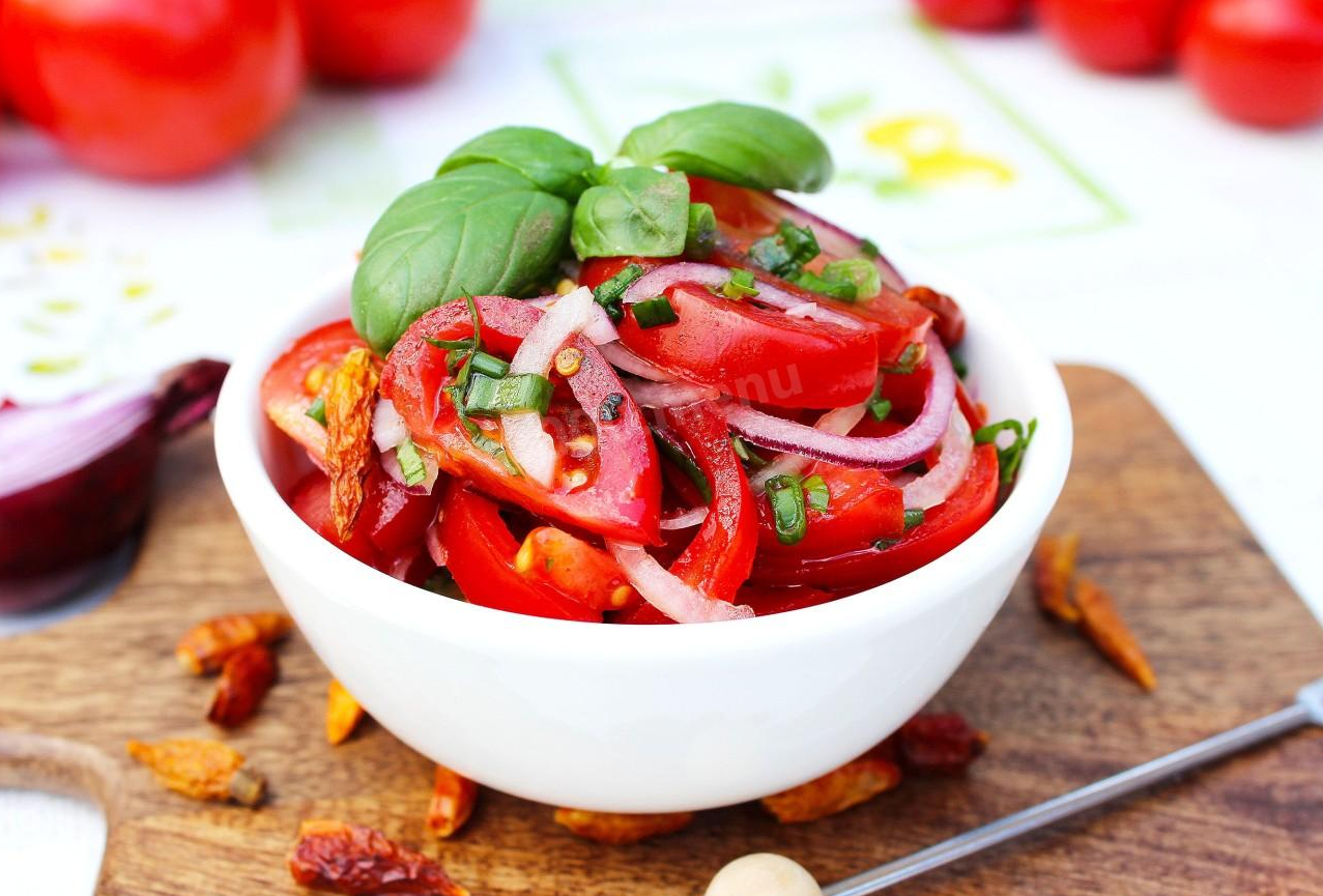 Тонко нарезанные розовые томаты, репчатый лук, стручковый перец и ароматный базилик