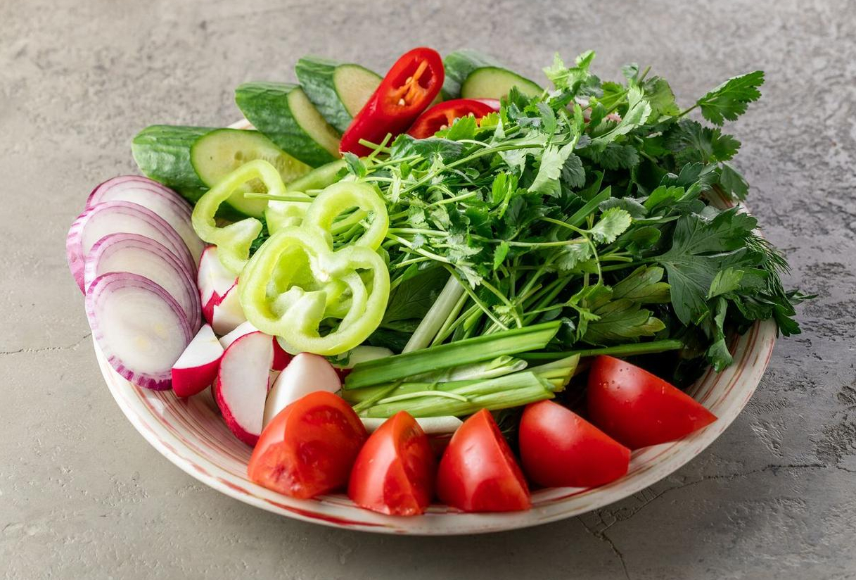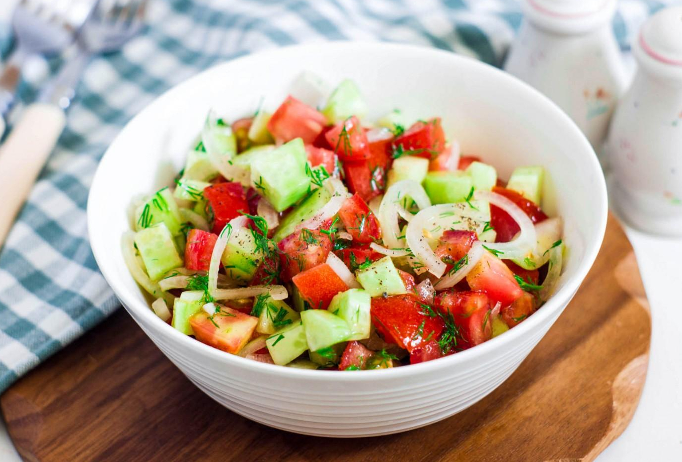 Огурцы, помидоры, лук, зелень. Заправляется подсолнечным маслом