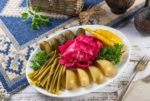 Черемша, перец чили, солёные огурцы, зелёные томаты, чеснок, капуста по-грузински