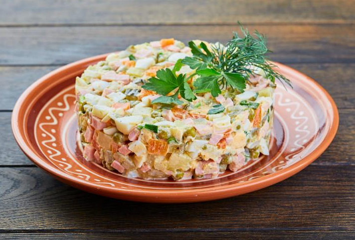 Колбаса, картофель, морковь, огурцы, яйцо, солёные огурцы, зелёный горошек, майонез.