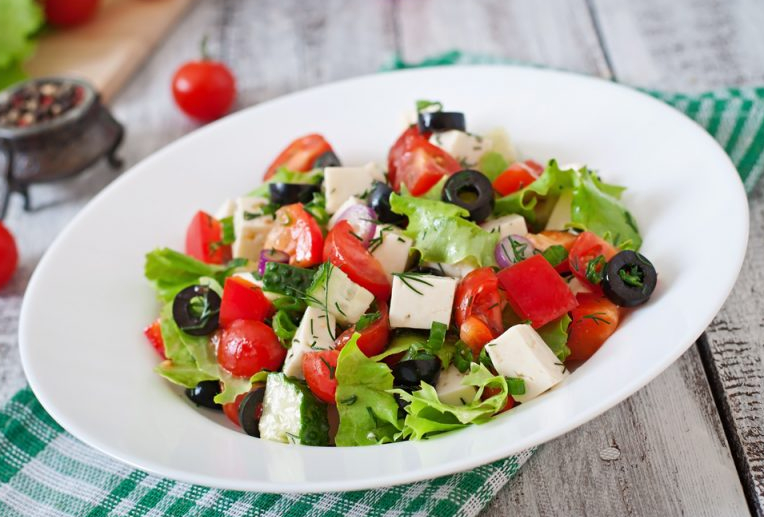Помидоры, огурцы, сладкий перец, красный лук, маслины, сыр фета, оливковое масло, лимонный сок